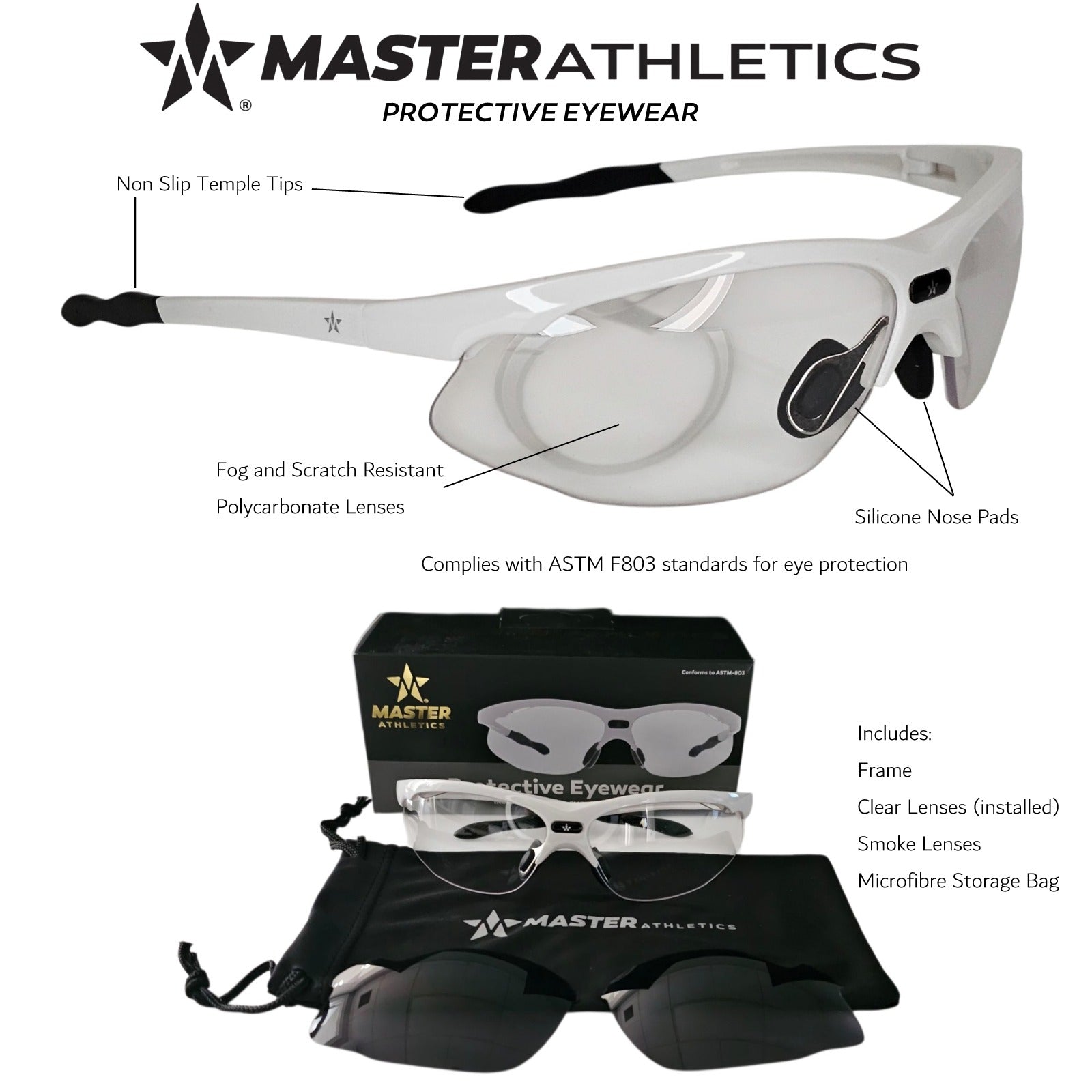 The Master Athletics Protective Glasses are made with polycarbonate shatterproof lenses for safety, flexible rubberized arms, and a nosepiece for comfort. Use the installed clear lenses for indoor/outdoor play or quickly change to the included Smoke lenses for those tough outdoor battles in the sun.
