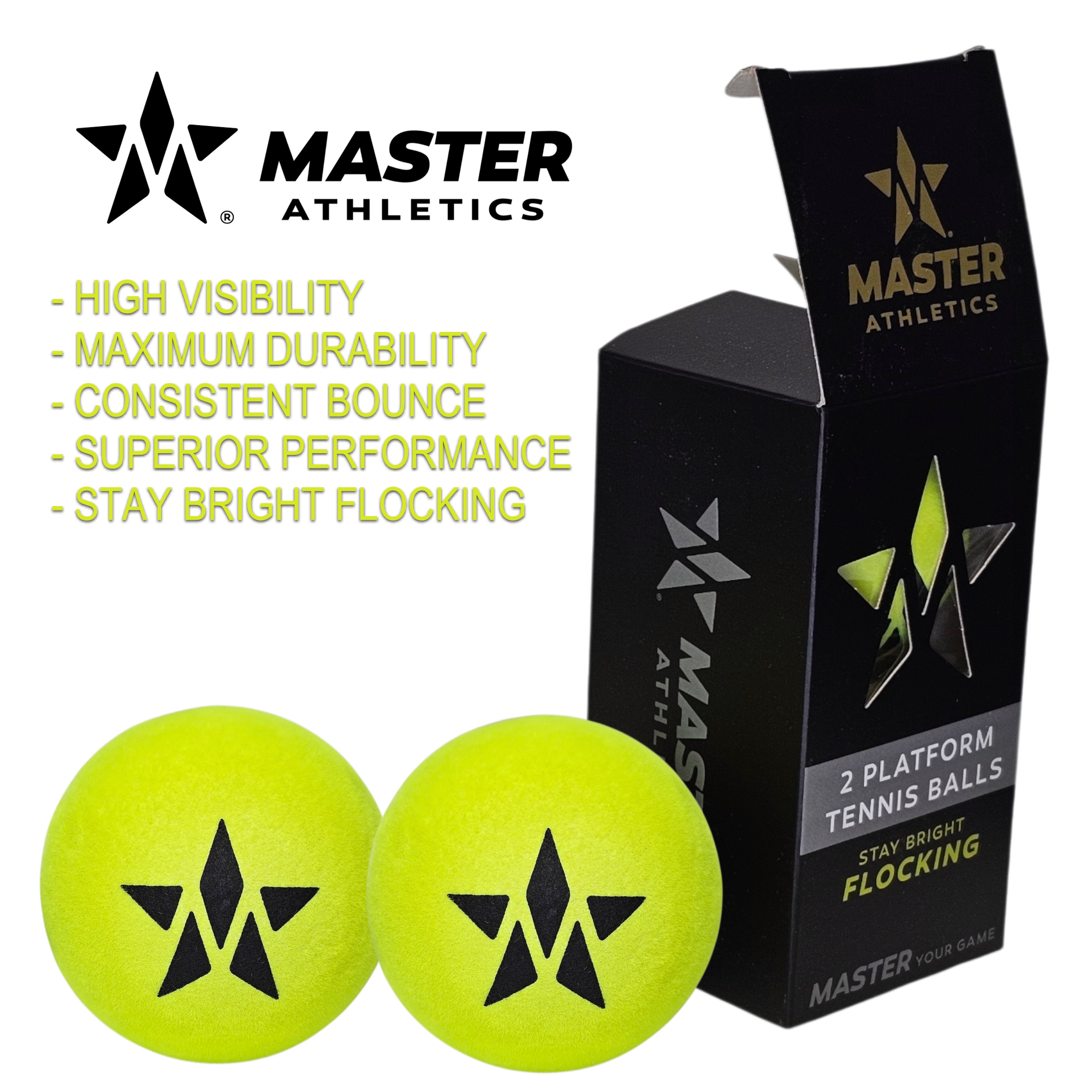 The Master Athletics High Visibility (HV) Platform Tennis Ball is engineered for superior performance with an all-new design that enhances visibility, durability, and playability.
